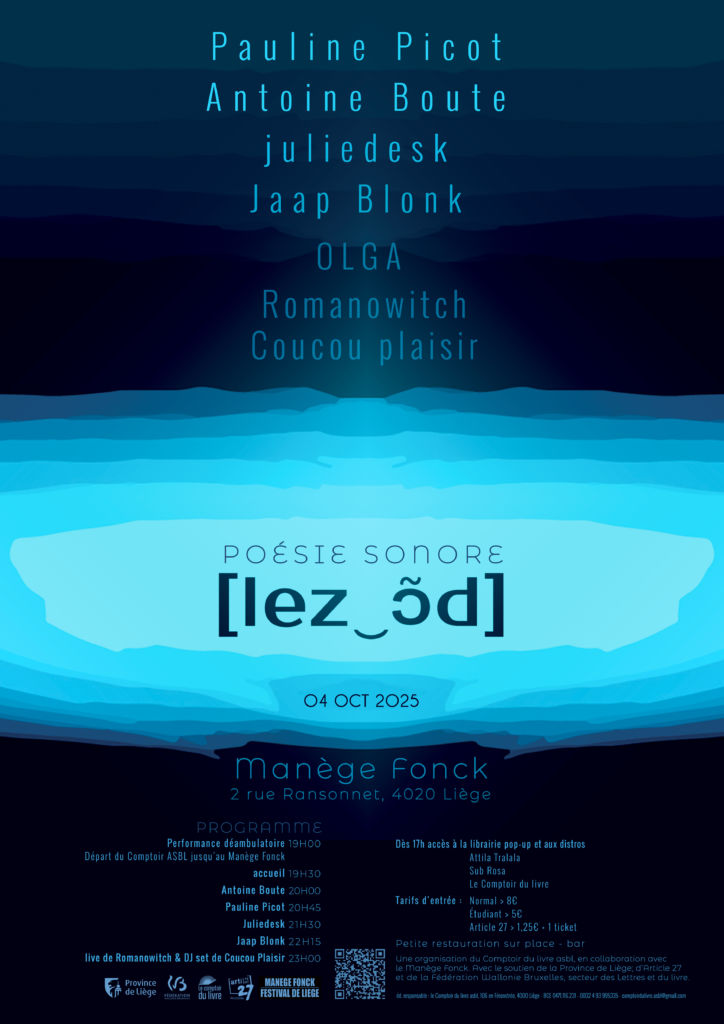Pour la deuxième édition Les ondes [ lez‿ɔ̃d] reviennent à Liège pour faire vibrer les murs du Manège. Cet événement, programmé par Le Comptoir des petits éditeurs et des métiers du livre, fait la part belle à la dimension « sonore » de la poésie : expérimentation de la voix, outils de diffusion acoustique, performances électro… La propagation de la poésie sera telle qu’il paraît même que tout le monde se mettra à danser !